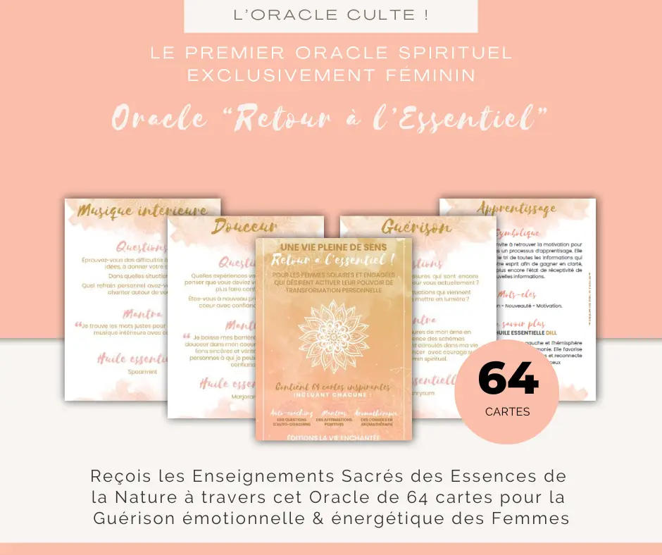 L’Oracle Retour à l’Essentiel est un outil de Guidance spirituelle unique qui associe la Puissance vibratoire des Huiles Essentielles à l’écoute de Soi. Chaque carte t’aide à te recentrer, t’ancrer ou t’ouvrir selon ton état émotionnel du moment.